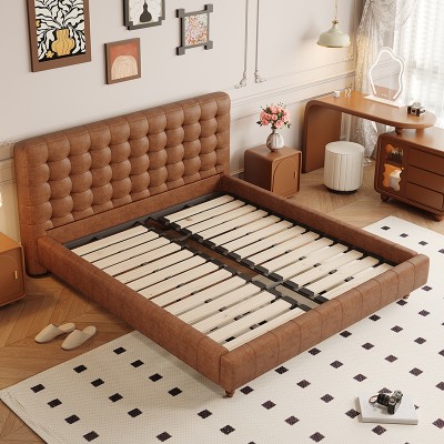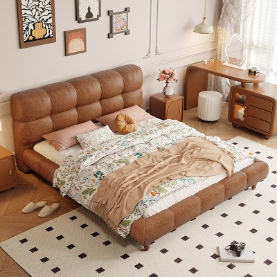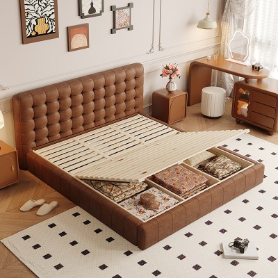 Medium-century style oil-waxed leather pine wood pneumatic bed board, high-quality and elegant solid wood bed