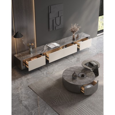 TV cabinet with aluminum alloy glass door, carbon steel bottom ring and sintered stone material