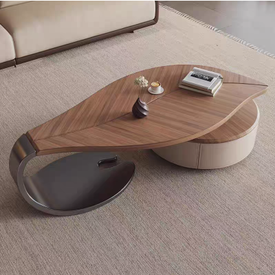 Coffee table crafted from stainless steel and solid - wood multi - layer board, featuring wooden veneer and a rock slab top