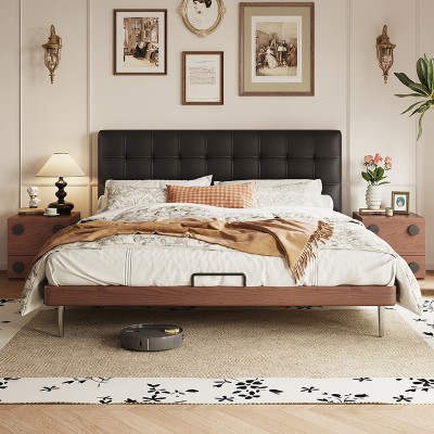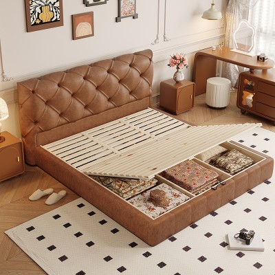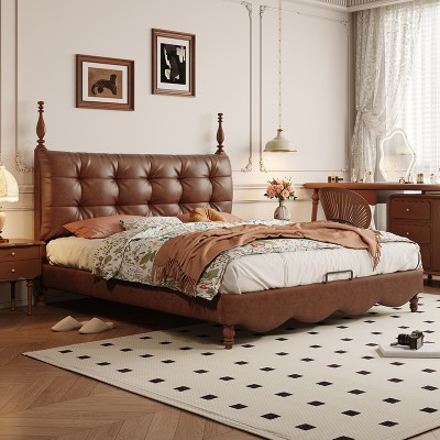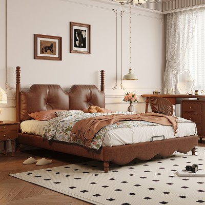 Medium-century style oil-waxed leather pine wood pneumatic bed board, high-quality and elegant solid wood bed