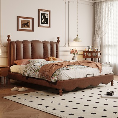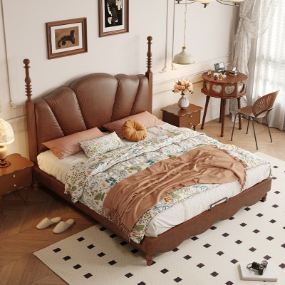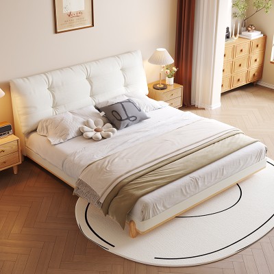 Solid Wood Bed, Cream-style Genuine Leather Bed, Modern and Simple Double Bed