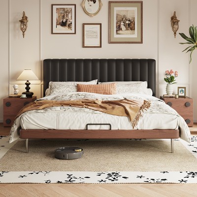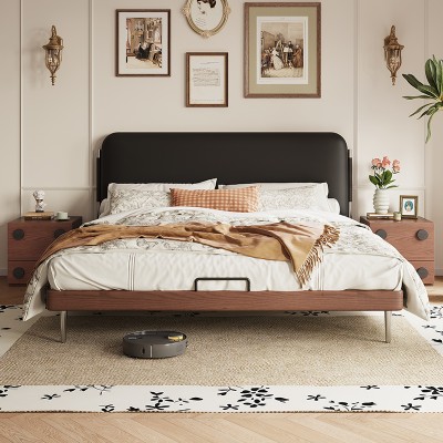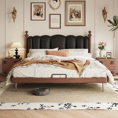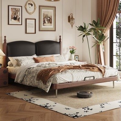 Mid-century style bed with oil-waxed leather and solid wood mortise and tenon bed board elegant solid wood bed
