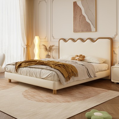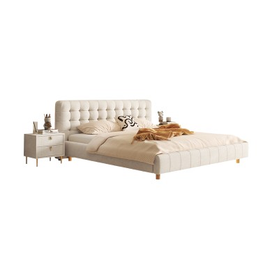 Cream-style French lamb wool fabric bed with a solid wood frame, showcasing a light luxury style