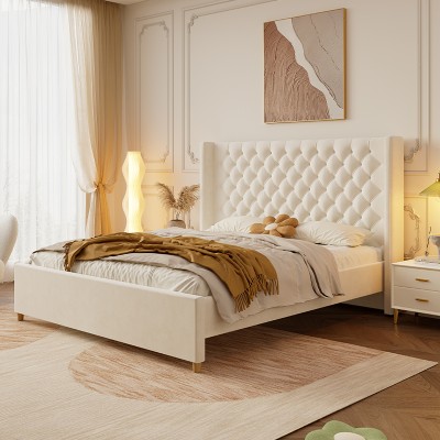 Fabric Bed, in French-style White Cream Aesthetic, with American-style Velvet