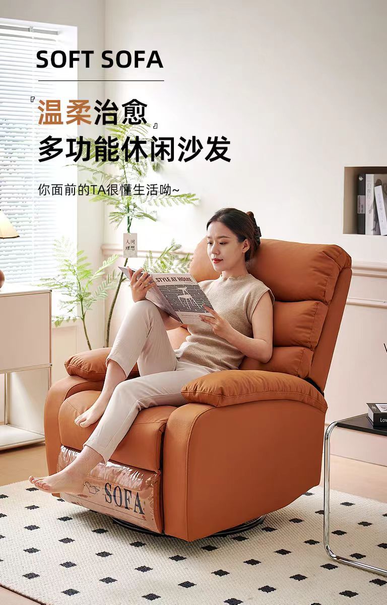 This sofa features a sturdy carbon steel telescopic base, ensuring stable weight - bearing and smooth, silent rotation, rocking, and stretching. With a simple pull of the manual switch, the footrest pops out and the backrest reclines.