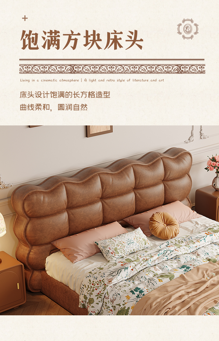 Medium-century style oil-waxed leather pine wood silent bed board, high-quality and elegant solid wood bed