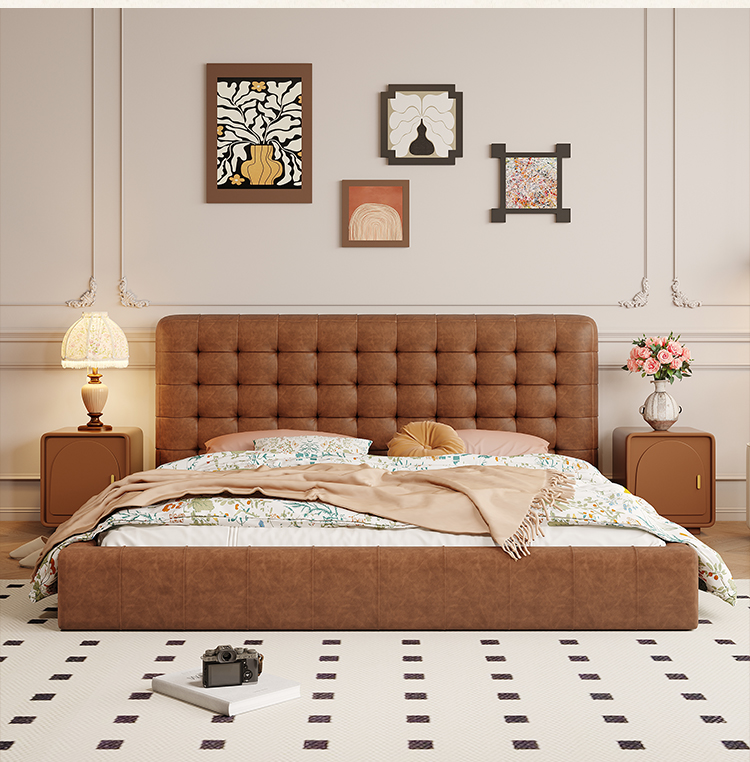 Product Name:Medium-century style oil-waxed leather pine wood pneumatic bed board, high-quality and elegant solid wood bed