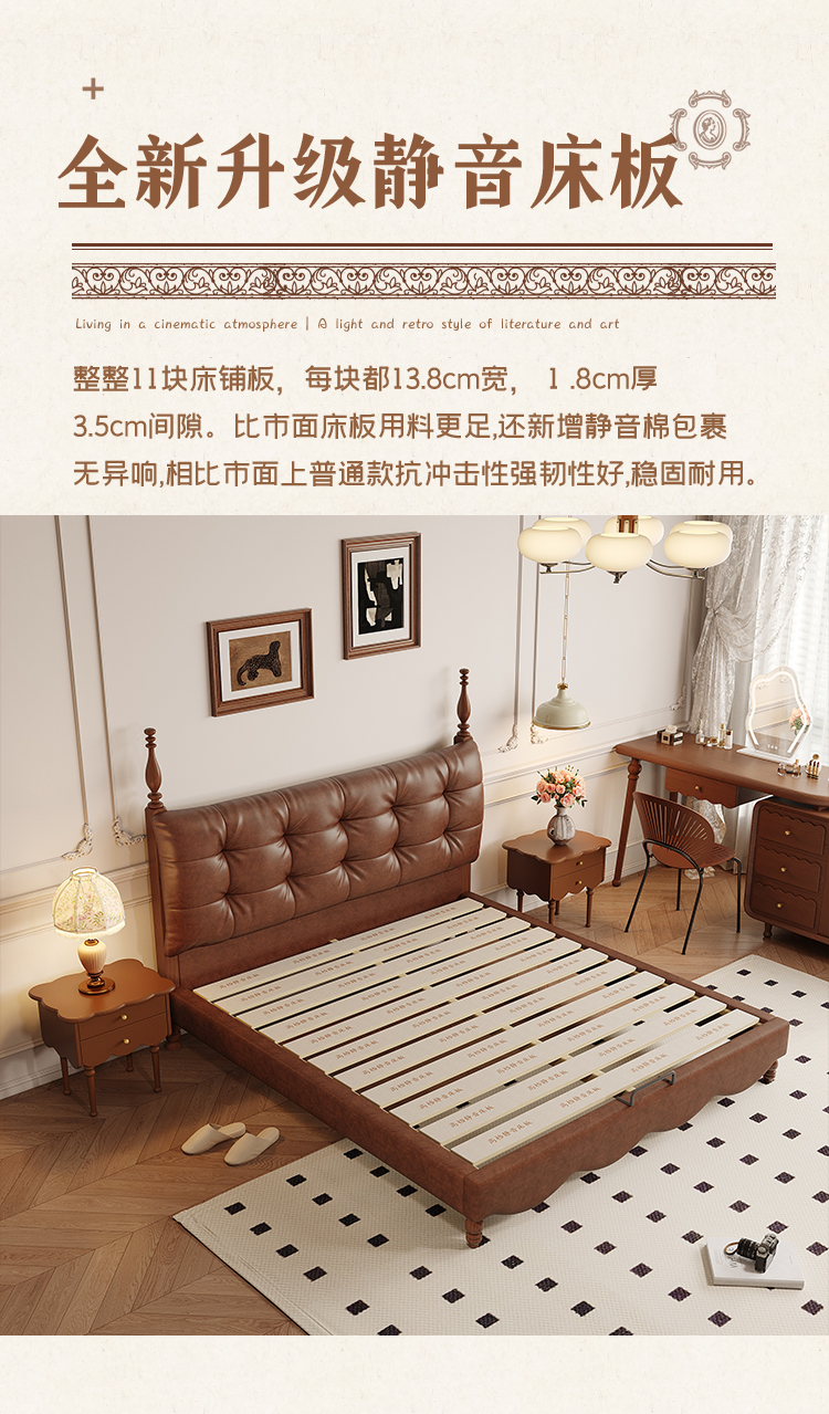 Product Name:Medium-century style oil-waxed leather pine wood silent bed board, high-quality and elegant solid wood bed