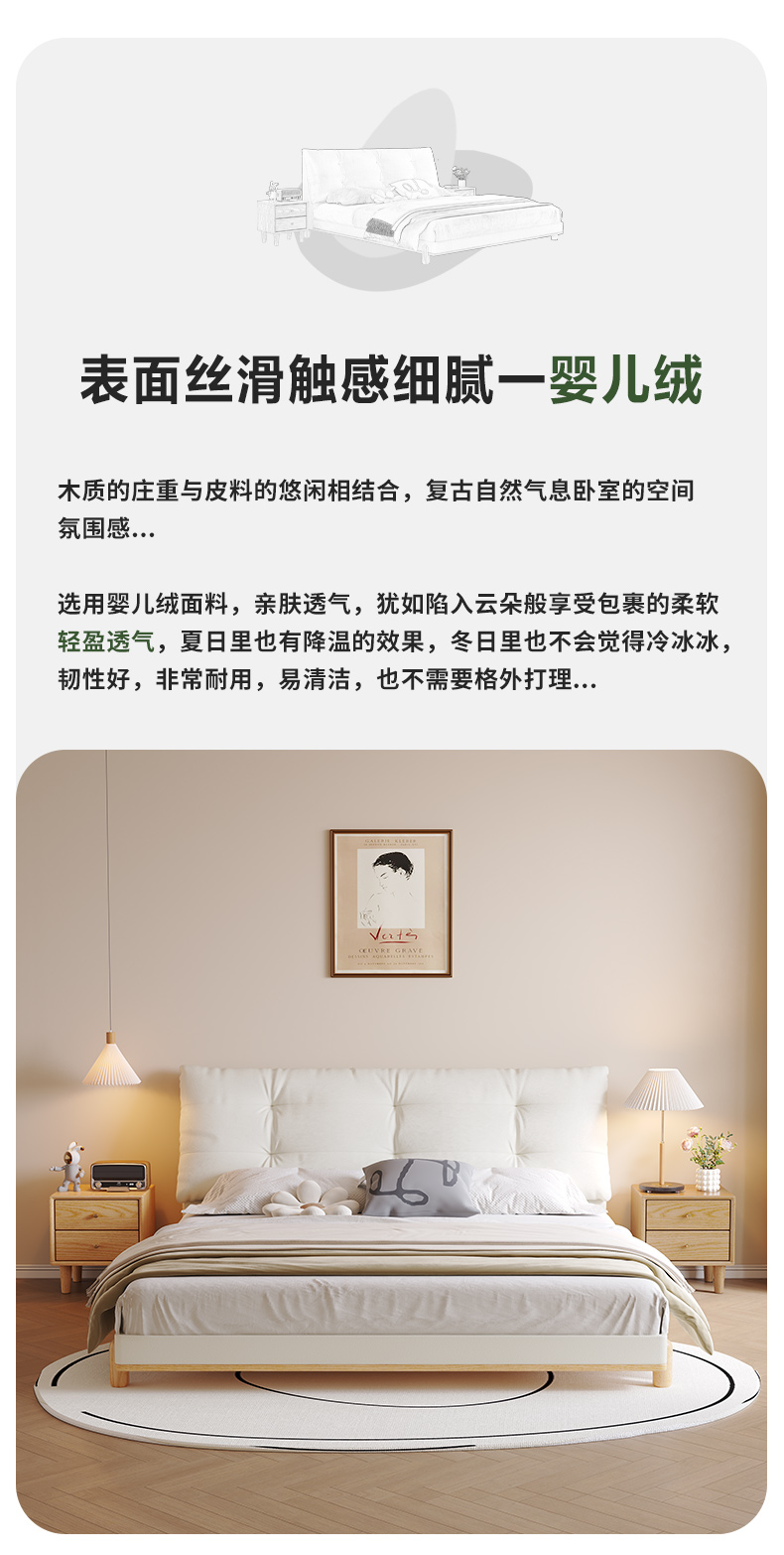 Product Name: A light luxury bed in the French cream style, featuring baby velvet fabric, a solid wood frame